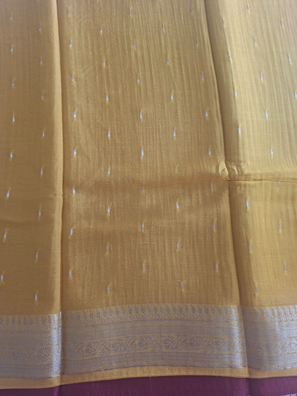 Elevate your ethnic wardrobe with this striking brick red saree, adorned with lustrous copper zari that catches light beautifully. The intricate tikki work adds dimensional texture and traditional craftsmanship to the weave. Paired with a pale yellow blouse, this combination creates a sophisticated color contrast that flatters a range of complexions. Perfect for festive occasions, weddings, and celebrations, this handcrafted piece showcases authentic Indian textile artistry with premium quality construction.